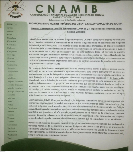 PRONUNCIAMIENTO MUJERES INDIGENAS DEL ORIENTE, CHACO Y